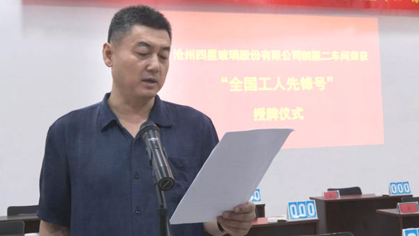 6月29日上午,滄縣總工會在滄州四星玻璃股份有限公司舉行“全國工人先鋒號”授牌儀式,為榮獲“全國工人先鋒號”的滄州四星玻璃股份有限公司制瓶二車間頒發表彰授牌,滄縣人大常委會副主任、總工會主席徐澤林,滄縣總工會黨組書記、常務副主席趙洪濤,中共滄縣縣委組織部副部長、兩新工委書記李金峰,滄州市總工會組織部副部長王超,紙房頭鎮黨委書記許勇,紙房頭鎮人大主席何玉利,紙房頭鎮人大副主席呂增煥,滄州四星玻璃股份有限公司董事長王煥一參加了授牌儀式。